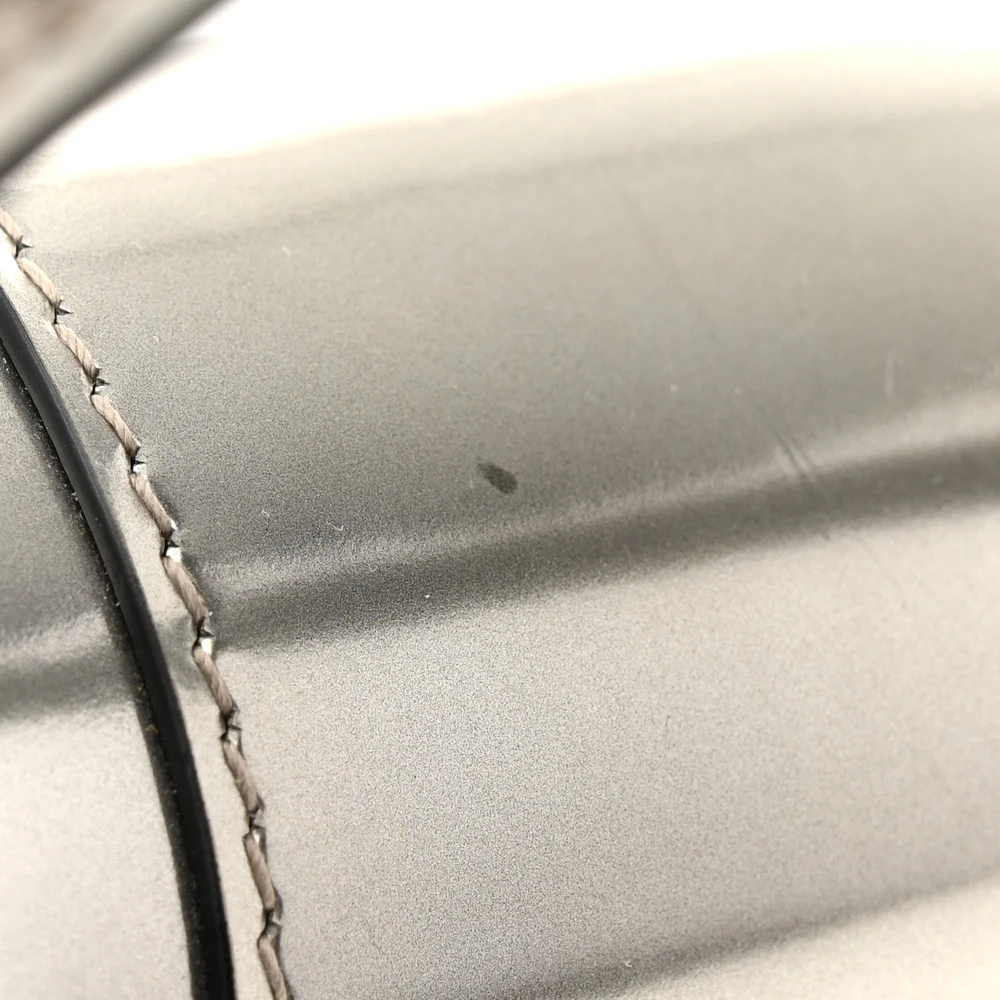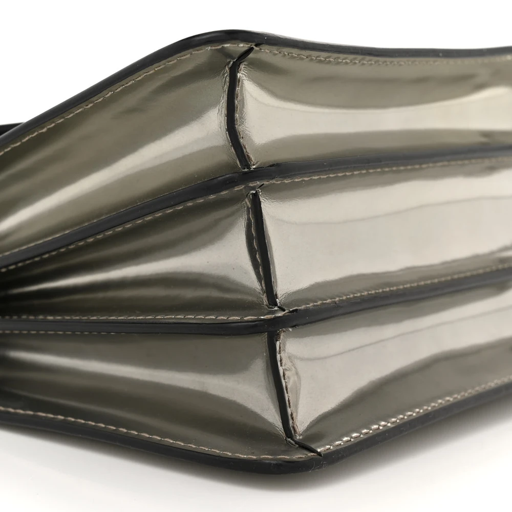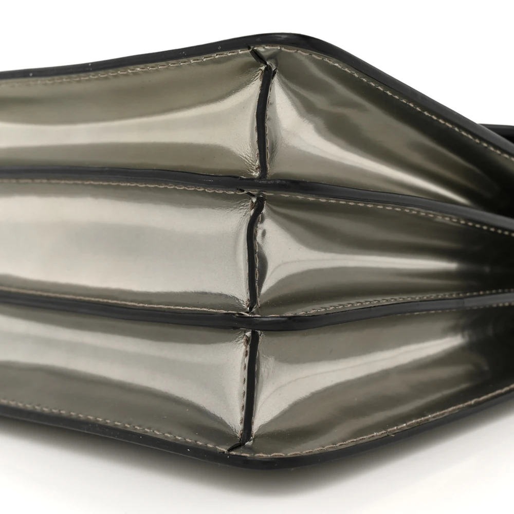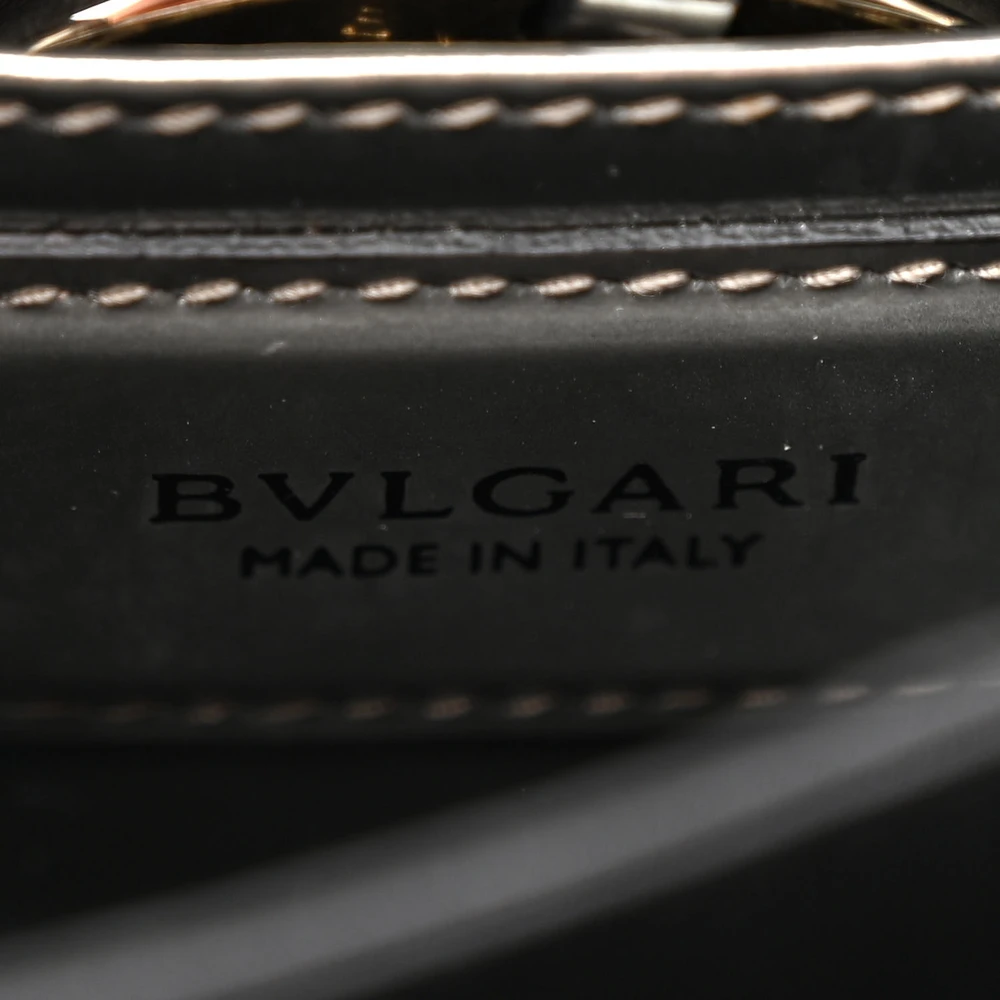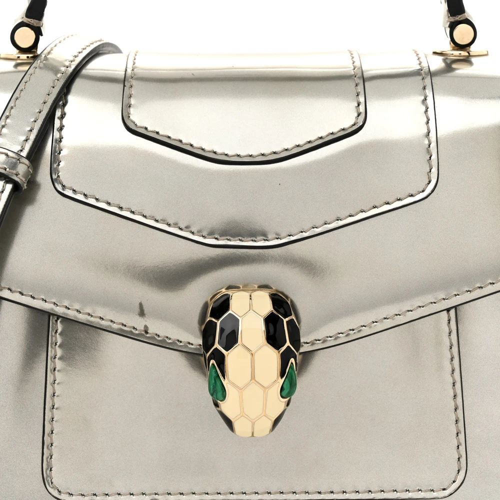 This Bvlgari Metallic Calfskin Serpenti Forever Top Handle in Silver is a standout piece crafted from metallic silver calfskin leather. It includes a front flap with an enameled snake head closure, gold hardware, and an optional gold chain leather shoulder strap. The interior is partitioned with black fabric and a small patch pocket, providing elegant and organized storage.